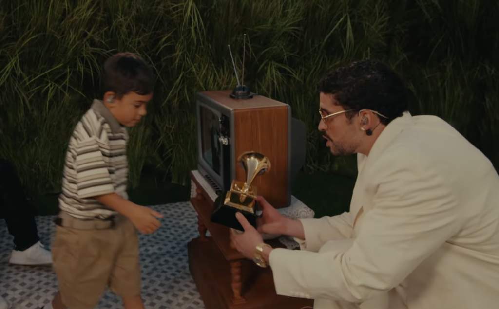 Ocurrió justo después de la euforia de «Tití Me Preguntó». Las luces bajaron y el escenario reveló una íntima sala de estar, típica de una casa latina, donde una familia veía la televisión. En la pantalla ficticia se transmitía el momento en que Bad Bunny ganaba el Grammy al Álbum del Año por «Debí Tirar Más Fotos» la semana anterior.